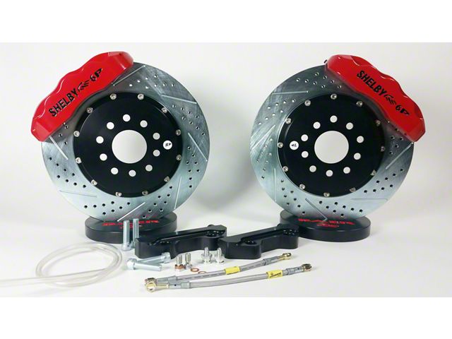 Construction and Appearance. This brake system features 13-inch brushed metal finish rotors that are drilled and slotted for heat dissipation and superior bite. The calipers are built with six stainless steel pistons and finished in a glossy red coating, complete with a matte black Shelby logo. Each hat is finished in matte black, while the raw metal brake lines are included for dependable hydraulic connection. All components are manufactured in Phoenix, Arizona using high-grade US-sourced forged or billet aluminum.