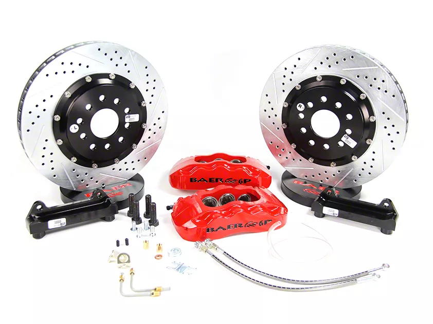 Exceptional Braking Power by Baer. Ensure high-quality braking power in your Mustang with the high-performance silver Baer Pro Plus Front Brake Kit with 14 inch Rotors. In a striking silver finish, this brake kit comes with 14 2-inch piece rotors with 6 pistons apiece, perfect for wheel sizes at least 18 inches.