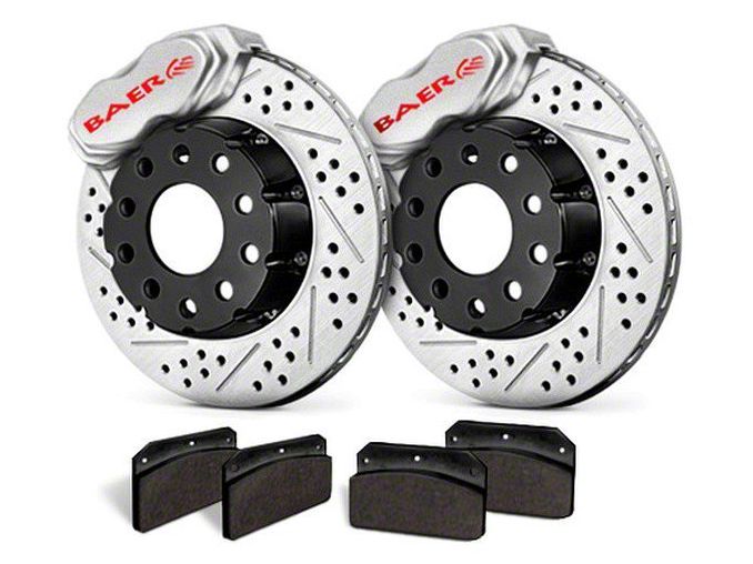 High-End Design. The hi-tech components in the Baer SS4+ Deep Stage Rear Brake Kit provide track appeal. The eye-catching drilled and slotted rotors are zinc-plated with anodized black hats. The clear coated caliper housing, hand-painted with the Baer logo, provides a professional-looking cosmetic for any custom Mustang. And because the brake assembly mounts to most beadlock tires, you can regrip your Mustang to give you a polished look at the line.