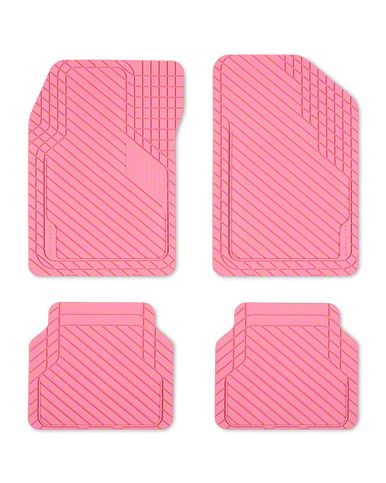 Construction and Appearance. These mats are made from sustainable materials, making them odorless and 100% recyclable. Their durable, chemical-resistant construction includes a thickened cross-section for enhanced protection and comes in a striking pink color. The mats feature a non-skid textured surface for added traction and safety.