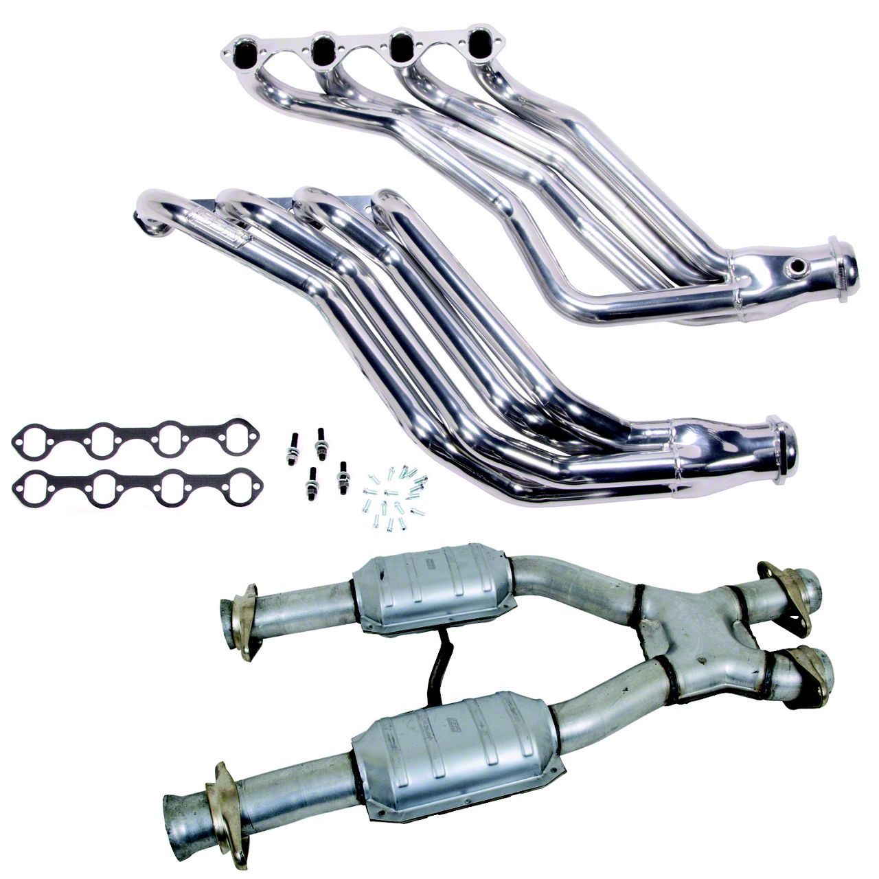 Description. These BBK Performance full length exhaust headers and matching high flow catted mid pipe kits offer unsurpassed value, performance, quality, and fitment. Dyno tested and built right here in the USA our products outperform the competition hands down.Every long tube exhaust header system is built with CNC mandrel bent tubing for unrestrictive exhaust flow and maximum performance. All headers include 3/8" laser cut exhaust flanges, patented scavenging collector design and gasket less ball and socket connectors to easily connect the matching mid pipes.These performance exhaust kits have been designed specifically for your vehicles application to get the most horsepower and torque to the ground for maximum performance across the RPM range.All matching mid pipes included in our kits have high flow catalytic converters installed optimum sound and performance gains.All of these BBK kits are designed to replace the factory shorty style headers and factory mid pipe. Each BBK long tube header and matching mid pipe kit will bolt directly up to your cat back exhaust on your vehicle to complete the system to the tail pipe.Our decades of exhaust design and experience make BBK Performance the number one choice for your late model American car or truck.