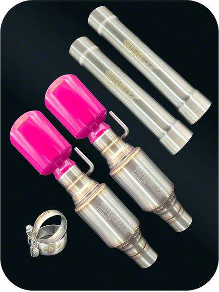 Construction and Appearance. This exhaust system is crafted from premium 304 stainless steel, ensuring durability and resistance to corrosion. It features a precision TIG-welded construction for superior strength. The aesthetic appeal is heightened by a sleek black powder-coated muffler and striking Bubblegum Pink 5-inch tips that complement any vehicle exterior.
