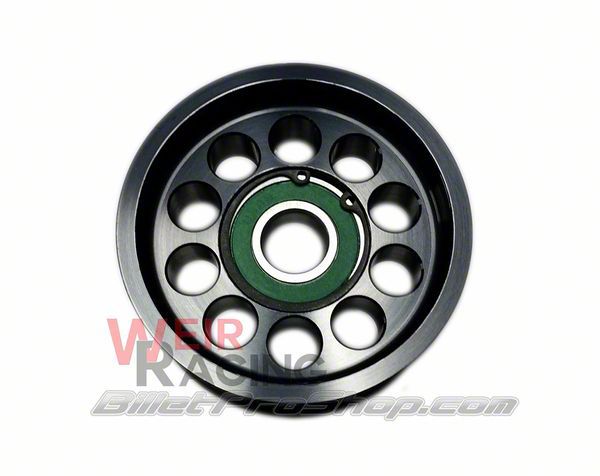 Installation. The Billet Pro Shop 10-Rib Grooved Idler Pulley requires the removal of the factory idler pulley and secure installation of the new pulley. The installation process involves aligning the pulley with the belt and securing it with the provided hardware.