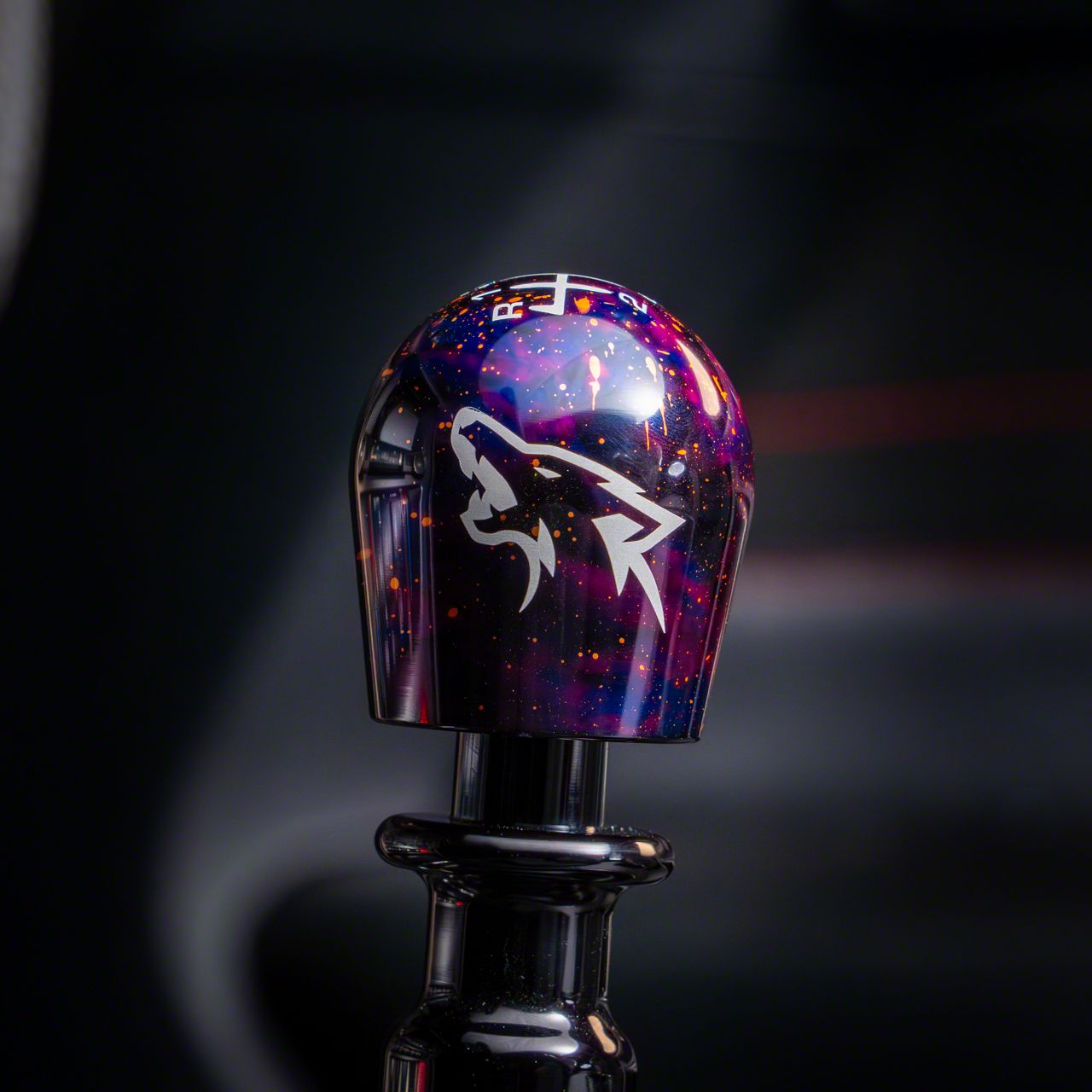 Construction and Appearance. Crafted from premium aluminum, this shift knob features a mirror-polished and anodized Purple Cosmic finish, providing a durable and scratch-resistant surface. The knob includes a stylish Coyote engraving, adding a touch of elegance to your vehicle's interior.