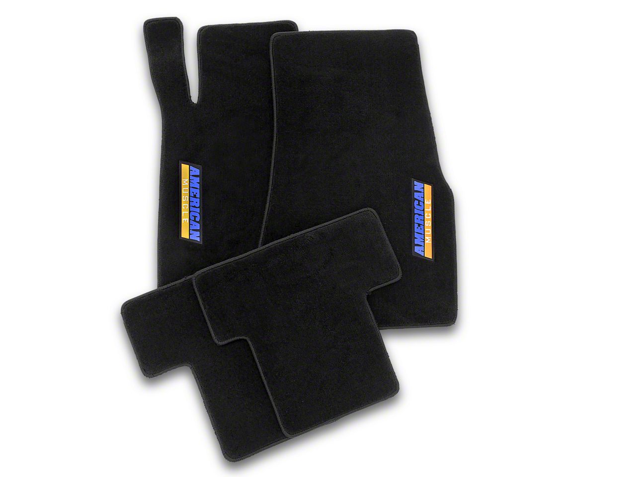 AM Logo. Add superb custom styling to your interior and impress the judges and passengers alike with these great looking Mustang floor mats. Proudly featuring the AmericanMuscle logo embroidered in blue, orange and white, these mats will make your Pony's interior stand out from the herd of look-a-likes.