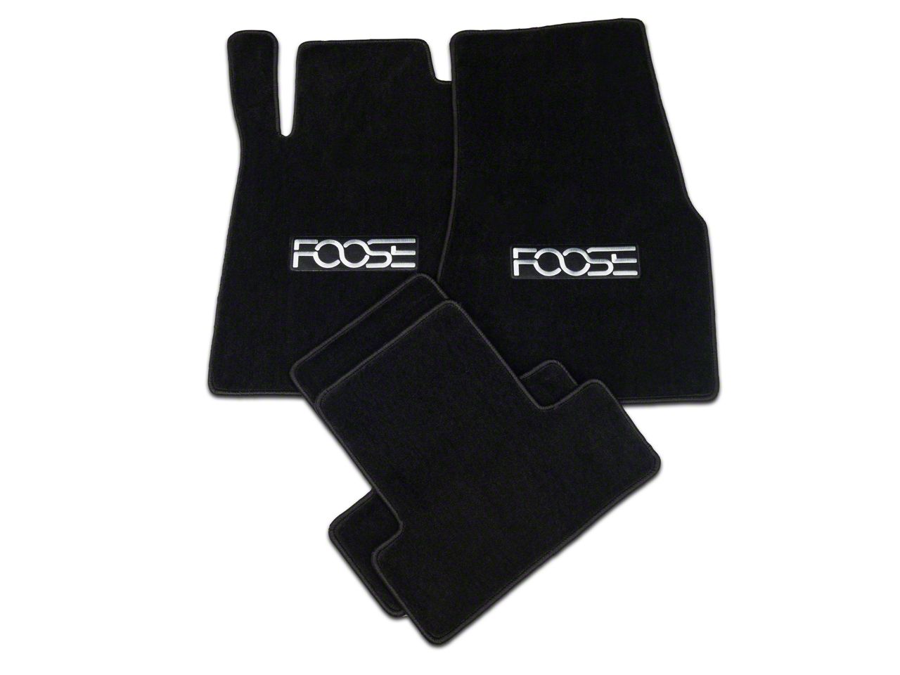 OEM Quality Materials. Die cut from long lasting cut pile carpet for a perfect fit, these black floor mats are completed with a stitched trim edge for a great finished appearance. The FOOSE logo is superbly embroidered on the front two mats in silver for impressive custom show car styling.