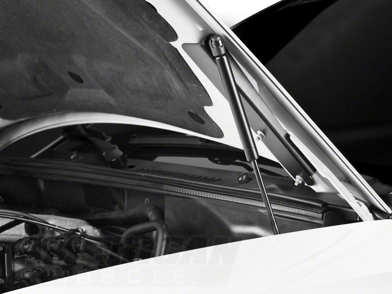 Style And Strength. Designed to get rid of that old ugly prop rod, this set of two powerful yet sleek MMD gas struts not only makes opening your Pony's hood much easier, but also holds it securely in place. Made from lightweight steel and aluminum, they have a black powercoated finish to give your engine bay a much cleaner appearance.