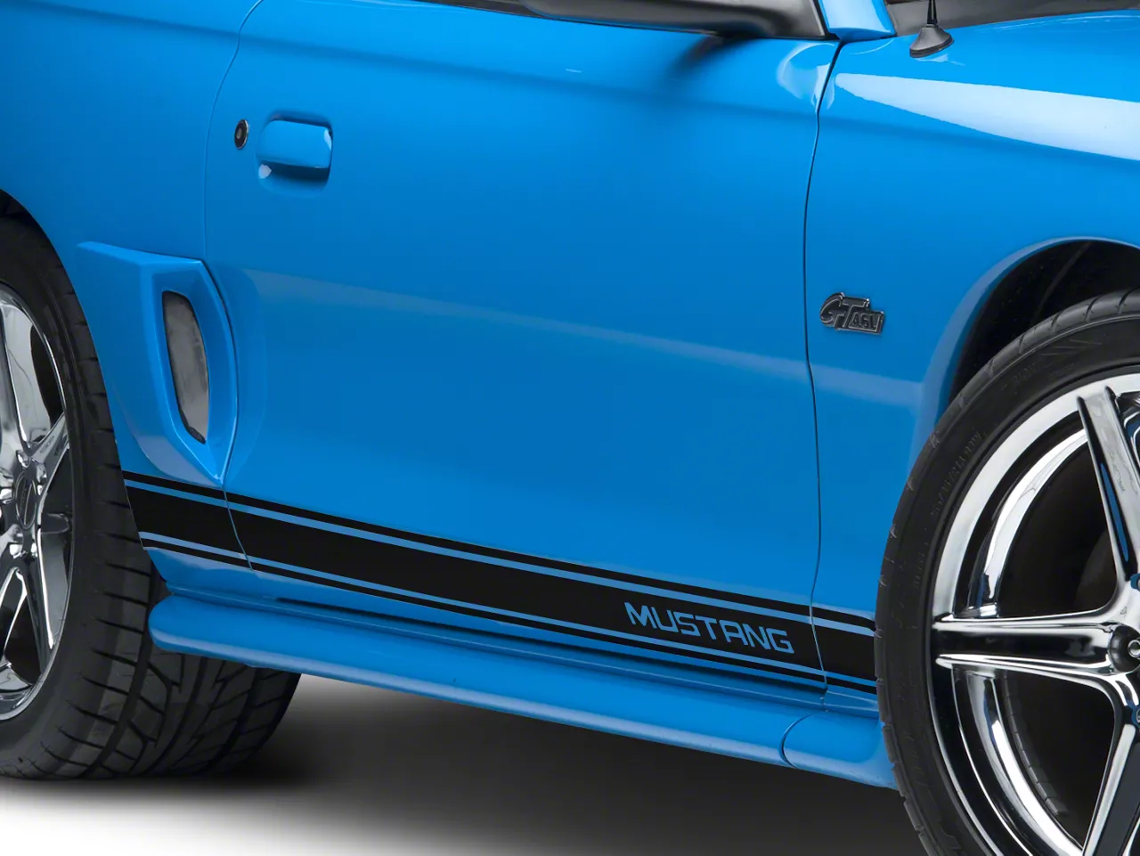 Retro Styling. Give your Mustang the cool retro styling of yesteryear with a set of Gloss Black Triple Rocker Stripes that feature "MUSTANG" lettering. These Gloss Black Mustang Rocker Stripes will look great on any model Ford Mustang.
