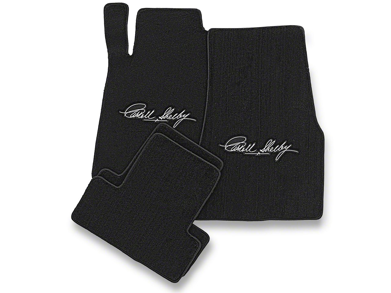 OEM Quality. These black floor mats are die cut from long lasting cut pile carpet for a perfect fit and are finished with a stitched trim for great looks. The Carroll Shelby signature is superbly embroidered in silver on the front two mats for impressive show-winning style.