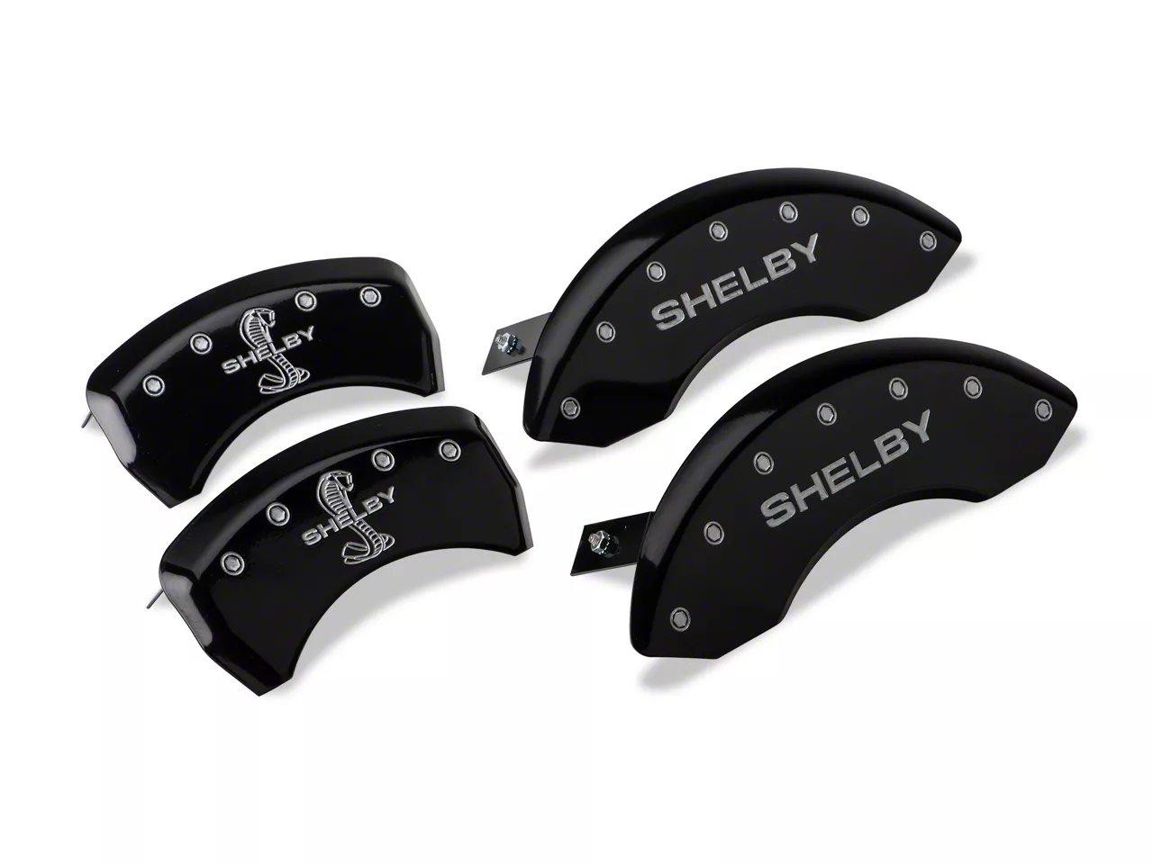 Shelby Cobra Styling. This set of four Black MGP Caliper Covers are a great way to set off your new rims and tires. They feature the iconic "Tiffany Snake" emblem on the rear covers with "Shelby" lettering on the fronts. Officially Licensed by Ford, these MGP Caliper Covers will give any Mustang a big brake race ready appearance that will turn heads.