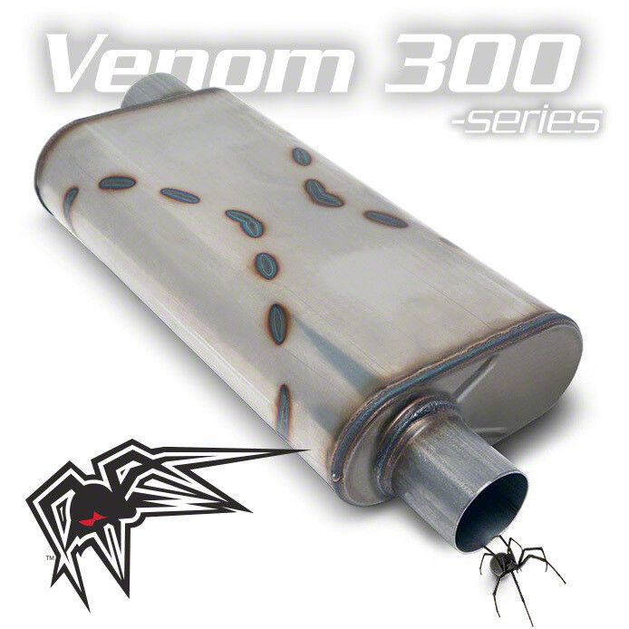 Body size: 18" x 9" x 4"Material: 409 Stainless SteelInside Diameter: 2.5"Bi-DirectionalOur Venom 300-series mufflers are made out of quality brushed stainless steel and, because of their larger body, produce a slightly quieter tone than our Venom 250-series. With Black Widow’s straight through patented internal hourglass design, the 300-series allows for optimal horsepower and torque without a harsh drone sound. All Venom 300-series mufflers are backed by our Limited Lifetime Warranty. Go to Warranty for details.NOTE: Because Black Widow mufflers are universal and not a direct OEM fit, we recommend installation by a qualified muffler shop.