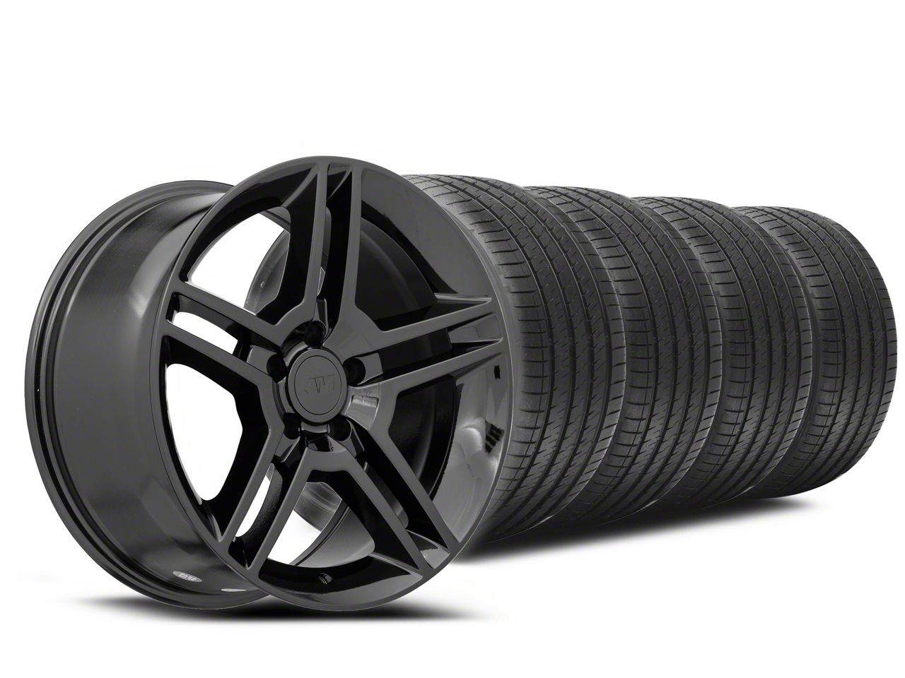 Black 2010 Style GT500 Wheel. Now you can have the modern split spoke styling of the 2010 Shelby GT500 Cobra for your very own Pony. These 18x9 GT500 rims feature a split 5 spoke design and a European style flange-less lip for awesome sleek styling. They are completed in a black clearcoated finish to protect against the hazards of road chips and pitting, you also get the added benefit of never noticing brake dust.