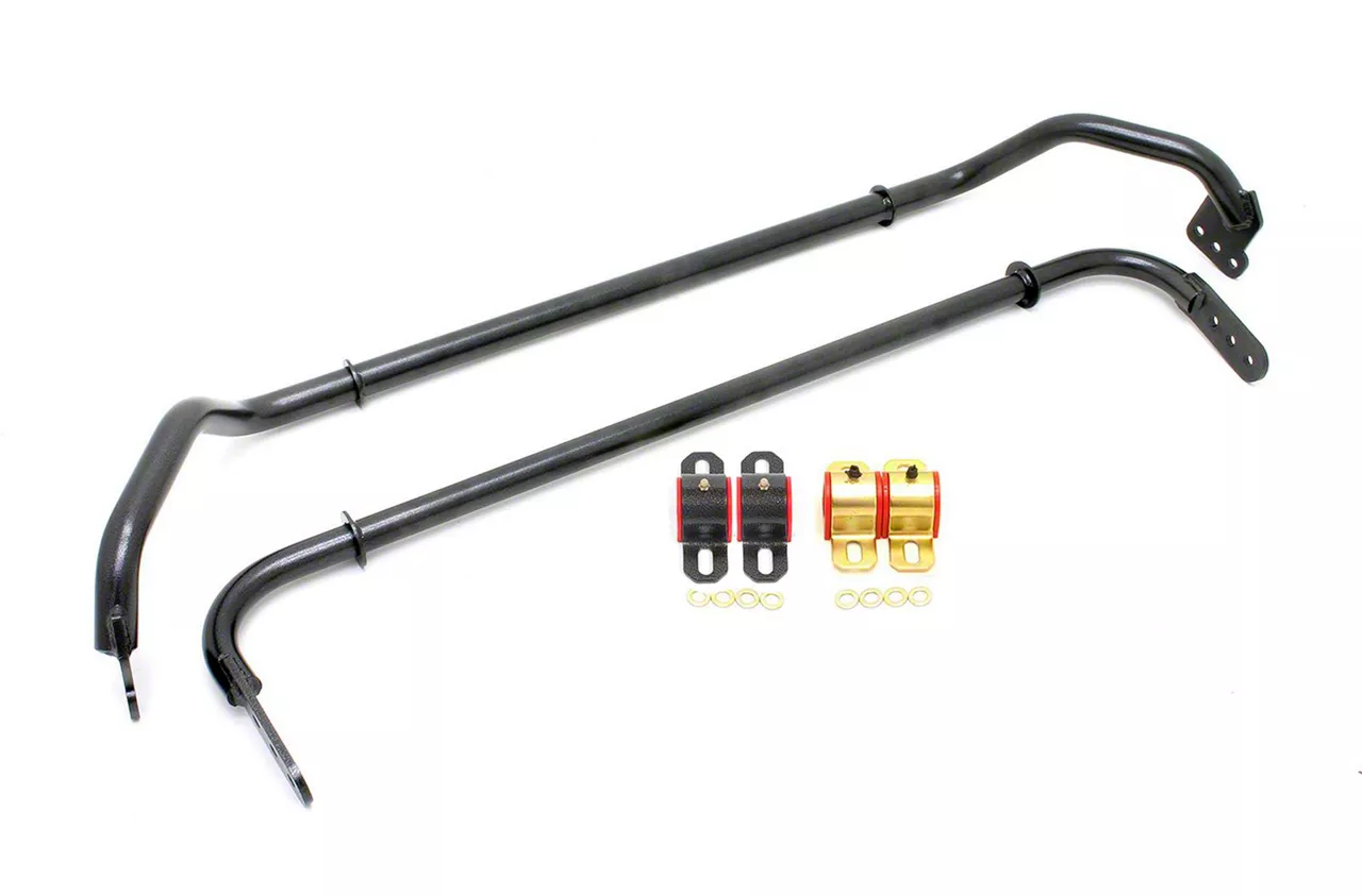 Dynamic Handling Upgrade. The BMR Adjustable Front and Rear Sway Bars are engineered to dramatically enhance the handling dynamics of your Chevrolet Camaro. Featuring adjustable front and rear bars with varying degrees of sway bar rate increases, these upgrades minimize body roll and improve cornering performance. The front sway bar offers a 58%-157% rate increase, while the rear sway bar provides a 63 - 208% increase, allowing for tailored handling characteristics.