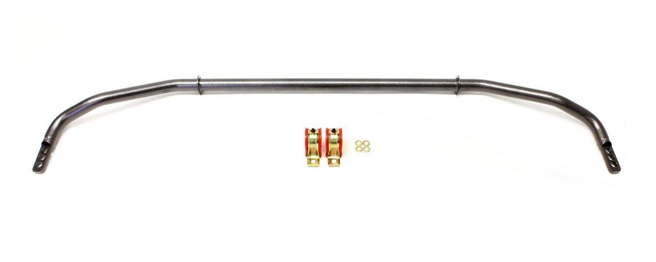 Description. The two primary functions of sway bars are to control body roll and to determine the understeer or oversteer behavior of a vehicle. Stock sway bars have low torsional spring rates because they are manufactured from small diameter bar stock or tubing. BMR Suspension’s SB033 rear sway bar was designed by factoring in the vehicle weight, application, motion ratio, coil spring rate, and adjustability requirements. Manufactured from heavy-wall 32mm DOM tubing, the SB033 is cold formed to better resist torsional fatigue and retain its "memory" far longer than the hot-formed bars used by many competitors. The sway bar is CNC-formed for exact manufacturing tolerances and repeatable high quality.Thrust washers are welded to the bar to locate the sway bar bushing mounts. This is critical as it properly locates the sway bar and prevents lateral movement during hard cornering maneuvers. The SB033 attaches to your Camaro with 88-durometer polyurethane bushings, reducing the deflection from the stock rubber bushings. These bushings are molded from 88-durometer, low-deflection, polyurethane, and are internally fluted to keeps grease in the bushing. The sway bar is 3-way adjustable to tune the amount of torsional spring rate and to determine the handling characteristics (understeer/oversteer) of the vehicle. BMR Suspension designed the SB033 sway bar for street performance, drag race, autocross, and road race applications. The large adjustable sway bar has three positions, giving you the versatility to drive to and from the track and still out handle the competition with the same sway bar. The SB033 gives you a 25%-200% increase in rate over the stock bar (depending on year and model). These rate increases and adjustability allow you to fine-tune the handling characteristics of the suspension so you can drive harder through corners with minimal body roll. The hollow design allows for loads of strength without adding a lot of weight. This allows for more sway bar control, which equals better handling. When performance is a must, rely on BMR Suspension! BMR Suspension’s SB033 sway bars are available in black hammertone and red powdercoat for long-lasting good looks. Installation time is about 1-2 hours. Proudly made in the U.S.A.! Below are rate specs compared to OE available bars: OE SS bar (FE4) -Hole number 1 provides just over 100% increase in rate over the factory FE4 bar -Hole number 2 is 150% -Hole number 3 is 200% OE ZL1 bar (FE5) -Hole number 1 provides just over 25% increase in rate over the factory FE4 bar -Hole number 2 is 40% -Hole number 3 is 75% FITMENT NOTE: SB033 IS DESIGNED AS A DIRECT REPLACEMENT FOR FE4 REAR SUSPENSION SYSTEMS, WHERE THE SWAY BAR END LINKS ARE LOCATED OUTBOARD OF THE REAR SHOCKS. THIS INCLUDES 2012+ ZL1 AND 2013+ SS. 2010-2012 SS MAY UPGRADE TO THIS FE4 BAR IF REAR LOWER CONTROL ARMS AND REAR SWAY BAR END LINKS ARE UPGRADED TO FE4 SPEC. SB033 WILL NOT FIT ON V6 APPLICATION DUE TO INTERFERENCE WITH REAR V6 BRAKE CALIPERS, OR CONVERTIBLE CAMAROS.