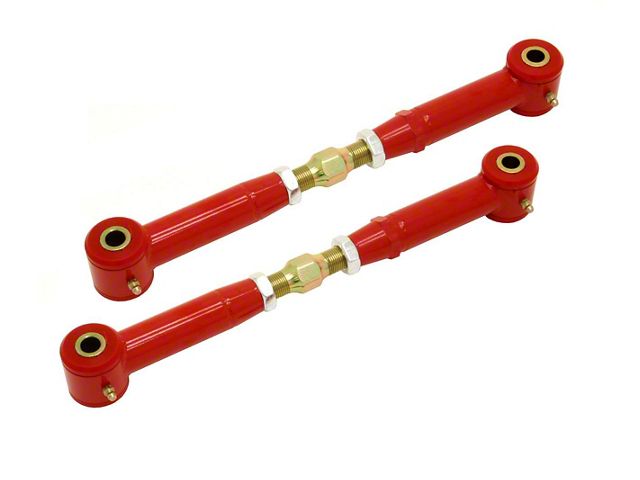 Description. Launching harder, reducing wheel hop, and adding cornering consistency to your 2010-2015 Chevy Camaro, Chevy SS, or Pontiac G8 is easy with adjustable lower toe rods from BMR Suspension. Stock stamped steel toe rods with soft rubber bushings deflect under load and absorb power instead of transferring it to the tires. BMR’s polyurethane, on-car adjustable tubular toe rods are the ultimate is strength and adjustability. Manufactured from heavy-duty 1¼-inch, 0.120-inch wall DOM steel tubing, the TR003 polyurethane toe rods nearly eliminate all control arm deflection. TIG-welded chrome-moly tube adapters with a center-mounted adjuster make on-car adjustments simple and easy. Greasable, internally fluted, 95-durometer bushings add a solid, more responsive feel over the stock rubber bushings. BMR’s bushing design allows grease to evenly coat the inner sleeve, keeping grease in the bushing under high loads. These flutes also direct grease to the outer edge of the bushing, keeping the thrust surface lubricated. This efficient lubrication ensures quiet, reliable operation over the life of the bushings. The stock toe rods flex under cornering loads giving you inconsistent handling characteristics. Combine this with soft rubber bushings that have massive amounts of deflection and you’re left with poor performance. The TR003’s heavy-duty construction and polyurethane bushings eliminate unwanted deflection, giving you much improved repeatability on the street, starting line, or in the corners. BMR’s polyurethane bushings are compliant enough to give you a comfortable ride and absorb NVH, while remaining firm enough to stand up to high loads of any performance environment. The bushings easily handle the high compression loads of hard launches and hard acceleration, yet offer plenty of articulation for great handling. These are the perfect upgrade for the enthusiast looking to improve performance at an affordable price, while maintaining acceptable NVH levels and ride quality. BMR CNC-machined center adjusters allow you to adjust the lower control arms easily without removing them from the car. BMR Suspension designed the TCA002 to work well in street performance, drag race, and road race applications. When performance is a must, rely on BMR Suspension! BMR Suspension’s TR003 on-car-adjustable polyurethane Toe Rods are available in black hammertone and red powdercoat for long-lasting good looks. Installation time is about 1-2 hours. Proudly made in the U.S.A.
