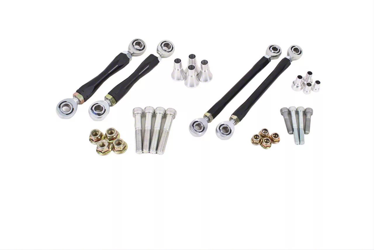 Suspension Control. The BMR Adjustable End Link Kit for Front and Rear Sway Bars in Black is a top-of-the-line product designed to enhance your vehicle's performance. This kit is specifically engineered for both front and rear sway bars, ensuring optimal suspension control. Experience superior handling with this end link kit, which boasts a no-deflection performance. Crafted with precision, the adjustable and CNC-machined design guarantees a perfect fit for your vehicle.