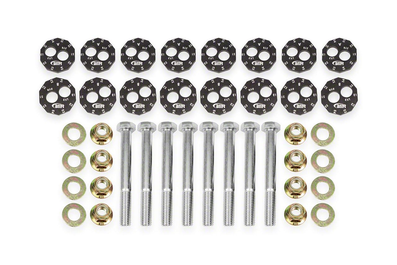 Improved Alignment Stability & Durability. Factory eccentric cams can degrade over time, especially under high load or spirited driving, leading to alignment drift and inconsistent handling. The BMR Front and Rear Lower Control Arm Camber Bolt Kit addresses this with upgraded Grade 8 and 10.9 hardware, reinforced lock‑out plates, and laser‑etched indexing marks that make repeatable adjustments easy. This ensures your alignment settings stay locked in, whether you're carving corners on the track or cruising on the street, delivering long‑term stability and confidence.