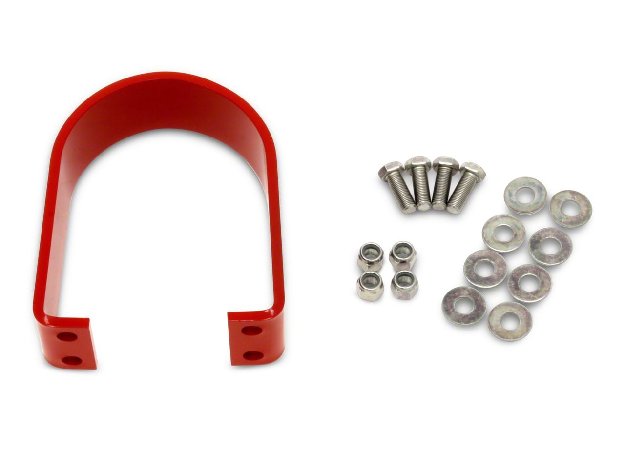 Durable Construction And Appearance. Crafted from 1/4-inch laser-cut CNC-formed plate steel, this driveshaft safety loop features a robust red powdercoat finish that provides both corrosion resistance and an attractive appearance. All necessary Grade 8 hardware is included for a secure installation.