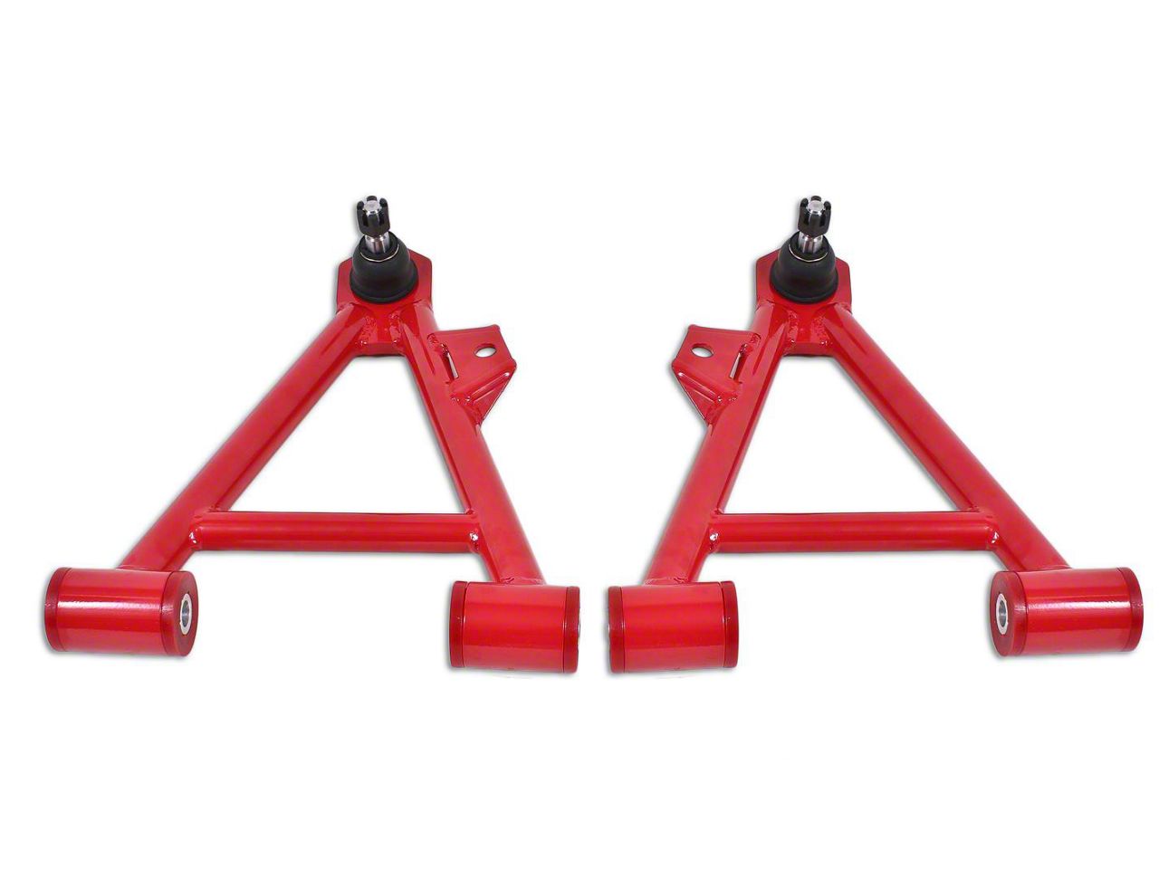 Heavy Duty Construction. The Red BMR Front Lower Non-Adjustable Coil-Over A-Arms are built from DOM 0.095” wall steel tubing with high durable and greasable polyurethane bushings that deliver a more responsive feel compared to the stock rubber bushings. The result is reduced arm bushing flex, improved handling on the street and better launches on the track as well as superior performance on rough terrain. The arms are finished in a durable Red powder coat for style accents and enhanced durability.