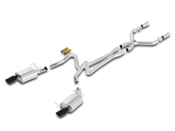 Application. This Borla ATAK Cat-Back Exhaust System with X-pipe and Black Chrome Tips has a versatile design that allows installation on 2013-2014 GT and BOSS 302 Mustangs equipped with either the stock manifolds or aftermarket shorty headers installed. It can also be installed on 2013-2014 GT and BOSS 302 Mustangs with a set of Borla's XR-1 Long Tube Headers by deleting the catalytic converters.