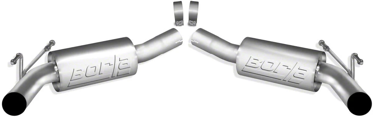 Cut and Clamp Installation. The installation of this Borla Axle-Back Exhaust system will require cutting and removing the stock muffler assemblies. The new Axle-Back assemblies will install in place of the old. Installation of this Borla Axle-Back can be completed in about two hours. This Axle-Back reuses the existing factory hangers for installation. Clamps and instructions are provided.