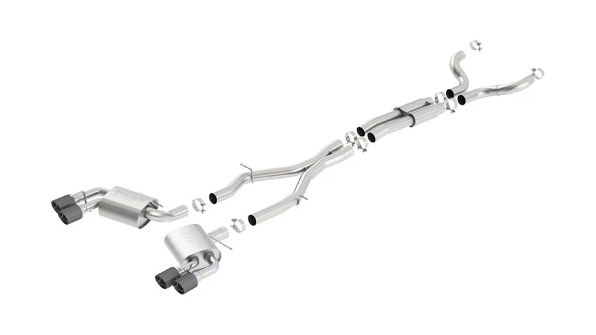 Premium Stainless Steel Construction. Borla manufactures their exhaust systems from premium 304 stainless steel tubing for superior strength and enduring corrosion resistance. Featuring ultra smooth mandrel bent 3-inch diameter piping and straight-through S-Type mufflers, this Borla Cat-Back will significantly out flow your Camaro's original factory exhaust system. This system also includes a pair of quad 4-inch carbon fiber tips with bright centers for impressive good looks.