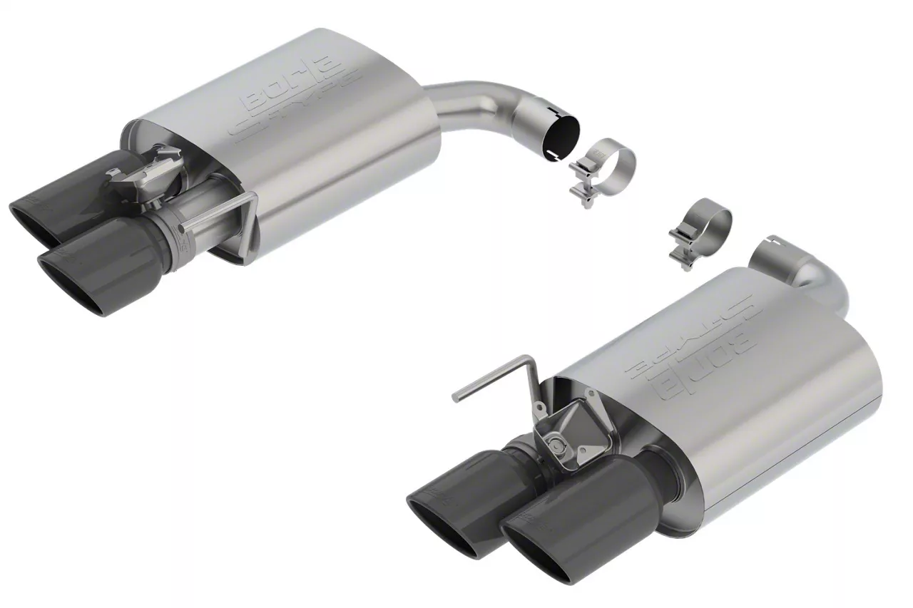 Aggressive Exhaust Note. It’s time to unleash the true potential of your Mustang with the help of this Borla Stinger S-Type Axle-Back Exhaust with Black Chrome Tips. This S-type axel-back exhaust uses a patented straight-through muffler design and mandrel-bent tubes to change your Mustang’s tame note into an aggressive roar that will blast other aftermarket brands away.
