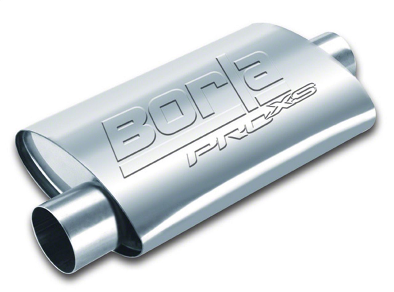 Optimized Exhaust Sound. Optimize that poor sounding exhaust sound with the top grade Borla Pro XS Center/Offset Oval Muffler - 2.5 Inch. This 2.5 inch muffler features a straight-through core internal construction with a brushed finish and standard outlet style without a tip. It is constructed using heavy-duty, T-304 stainless steel for long-lasting performance on the street or off-road.