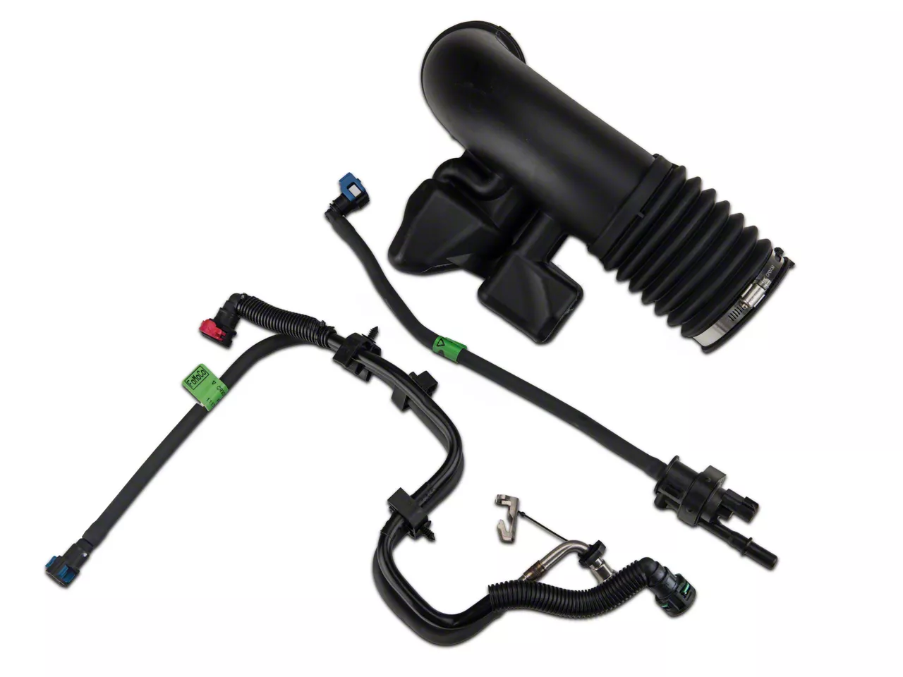 The Ford Racing BOSS 302 Intake Manifold Installation Kit comes complete with fuel vapor hose (CR3Z-9G297-A), bracket (CR3Z-9G290-B), screw, fuel supply assembly and air inlet tube (CR3Z-9J280-A).