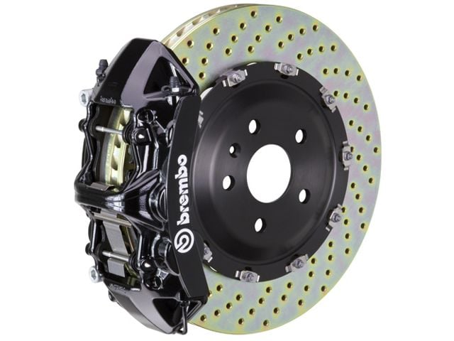 Description. Big Brake Kit; 6 Piston Black Calipers; 380x34 2-Piece Drilled Rotors; With Brake Pads; Vented Curved 48 Vane; Advanced High Carbon Alloy, Corrosion Resistant Plating; Floating H-Bobbin with Anti Rattle Spring Mounting; Front