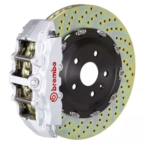 Description. Big Brake Kit; 8 Piston Silver Calipers; 380x34 2-Piece Drilled Rotors; With Brake Pads; Vented Curved 48 Vane; Advanced High Carbon Alloy, Corrosion Resistant Plating; Floating H-Bobbin with Anti Rattle Spring Mounting; Front