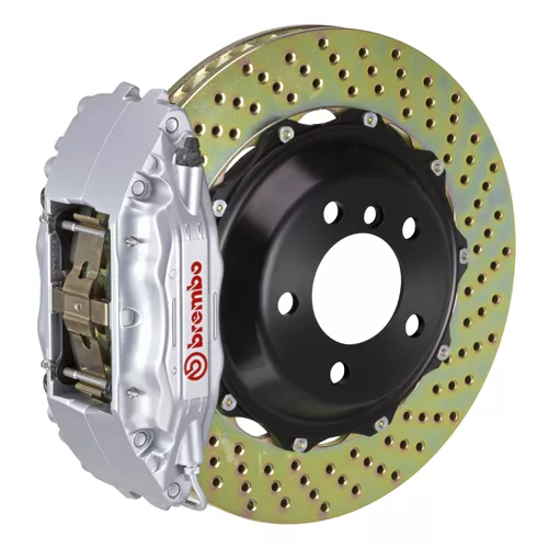 Superior Braking Performance. The Brembo GT Series 4-Piston Front Big Brake Kit with 14-Inch 2-Piece Cross Drilled Rotors; Silver Calipers offers exceptional stopping power for both track and road use. This system enhances vehicle safety and driving dynamics by providing consistent and reliable braking performance under demanding conditions.