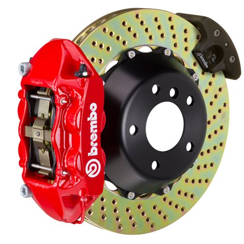Description. Big Brake Kit; 4 Piston Red Calipers; 380x28 2-Piece Drilled Rotors; With Brake Pads; Vented Curved 48 Vane; Advanced High Carbon Alloy, Corrosion Resistant Plating; Floating D-Bobbin with Anti Rattle Spring Mounting; Rear