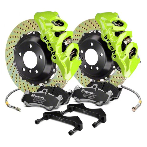 High-Strength Rotors. The Brembo GT Series 6-Piston Front Big Brake Kit with 15.90-Inch 2-Piece Cross-Drilled Rotors (Fluorescent Yellow Calipers) is the perfect upgrade for track day aficionados or drivers who require the best performance from their cars. This kit includes a pair of 15.90-inch cross-drilled rotors with corrosion-resistant plating, along with a floating H-bobbin and anti-rattle spring mounting.