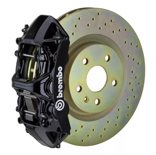 Enhanced Big Brake Kit. Raise the stopping power of your Mustang on the front end using this Brembo GT Series 6-Piston Front Big Brake Kit with 14-Inch 1-Piece Cross Drilled Rotors; Black Calipers. This kit is made for a range of Mustang performance vehicles and raises the stopping performance of your ride, especially when repeatedly slowing while going downhill or racing.