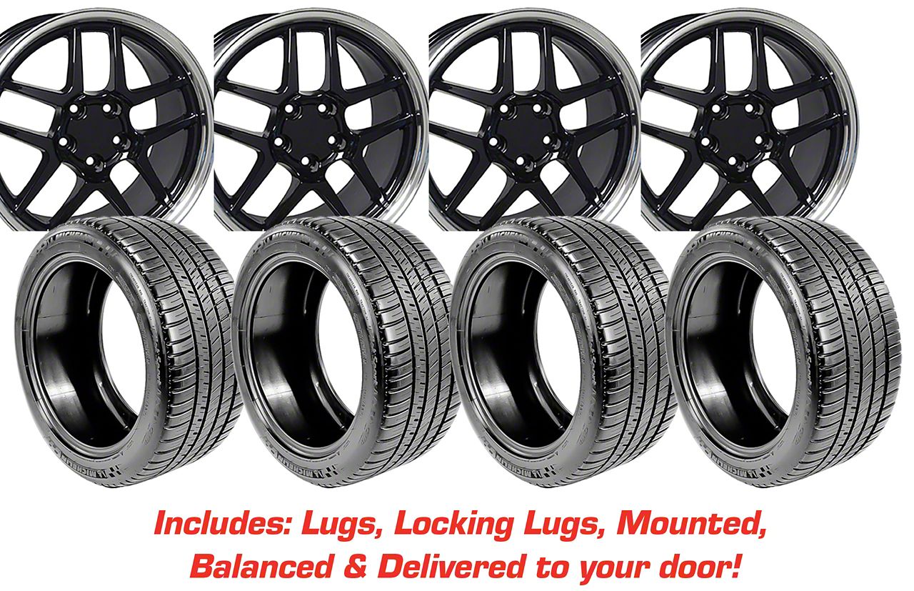 Construction and Appearance. Designed with lightweight and durable aluminum construction, these C5 Z06-style wheels feature a striking gloss black finish with a machined lip for a sleek, aggressive look. Paired with Michelin Pilot Sport A/S 4 all-season tires, this kit ensures superior grip, stability, and ride comfort in various weather conditions.
