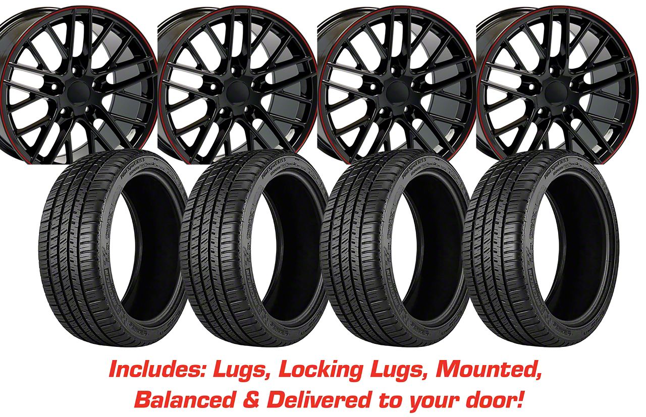 Construction and Appearance. The wheels feature a glossy black finish for a sleek and bold aesthetic, perfectly complementing the Corvette’s design. Crafted in a staggered 17x9.5/18x10.5 configuration, these rims enhance stability and grip for high-performance driving. The Michelin Pilot Sport A/S tires ensure year-round reliability with all-season traction, making this kit ideal for any driving condition. The lugs and locking lugs, also finished in glossy black, complete the package with added security and style.