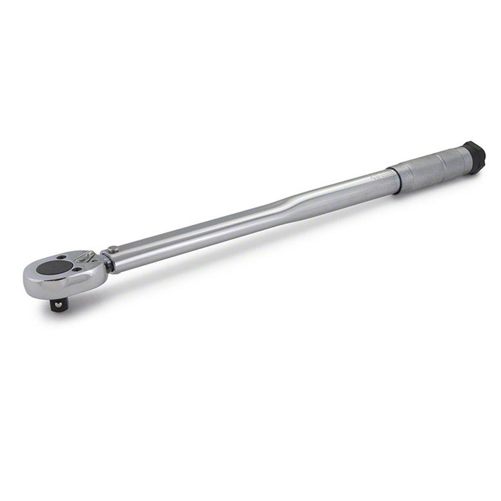 Precision Tightening Tool. The 1/2-Inch Drive Torque Wrench is a universal tool designed to provide precise torque application ranging from 10 to 150 ft.-lbs. This click-style torque wrench features a reversible ratchet mechanism, making it versatile for various tightening or loosening tasks. Constructed from durable steel and finished with chrome, this wrench combines strength, longevity, and a sleek appearance. Its universal design ensures it can be used across a wide range of applications, making it an essential tool for automotive work, machinery maintenance, and other tasks requiring specific torque settings.