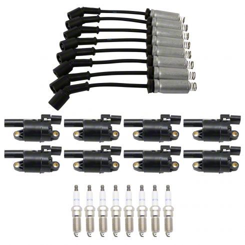 High-Grade Parts. The ignition coils are a direct replacement style. The ignition wires are the noise-suppressing type and come with wire wound stainless steel cores and 7mm silicone insulation. Iridium spark plugs are also included in the kit to complement the other components.