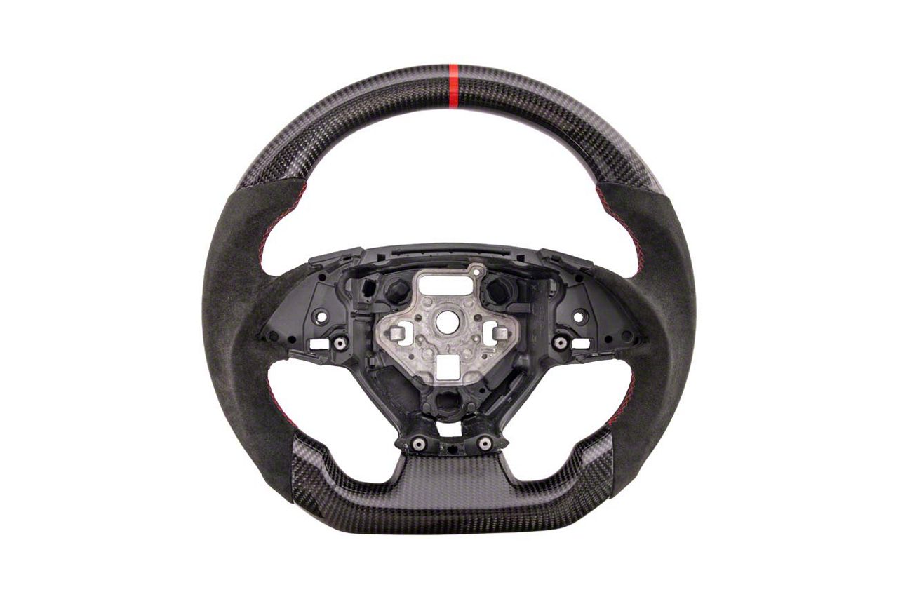 Construction and Appearance. This steering wheel is built on a lightweight carbon fiber frame available in either standard or honeycomb weave patterns. It features ergonomic black perforated leather grips and vibrant red contrast stitching for enhanced style and hold. The Alcantara surface offers a refined texture while the non-LED red center stripe provides visual driving alignment. This model is tailored for automatic transmission configurations and does not support heated functionality.