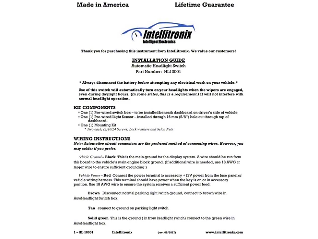 The Intellitronix automatic headlight switch allows you to have the modern luxury of automatic headlights without sacrificing the comfort of the great car you already own, no matter how old it is! Features include a deactivation switch and wiper connection to automatically turn on your headlights when you turn on the wipers.