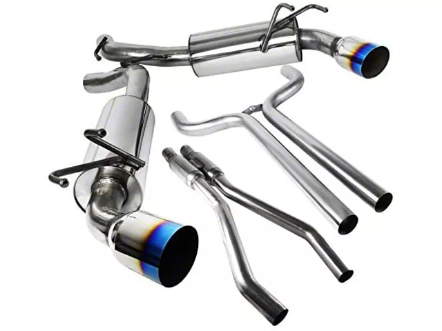 T-304 Stainless Steel Construction. This Cat-Back Exhaust system is manufactured from 2.25-inch diameter, mandrel-bent, T-304 stainless steel tubing for excellent exhaust flow and corrosion resistance. Besides the crossover mid-pipe, this system features a pair of high-flow mufflers that end with burnt blue, T-304 stainless steel exhaust tips for impressive styling.