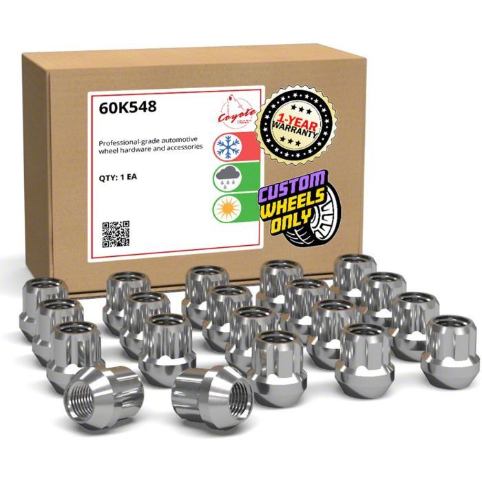 Secure Performance. Upgrade the security and appearance of your Camaro's wheels with the Chrome OE Truck Spline Lug Nut Kit; 14mm x 1.5; Set of 20. Designed to be both visually stunning and incredibly functional, this set of 20 chrome lug nuts offers the ultimate blend of style and performance. They feature a premium chrome finish that not only enhances the look of your wheels but also offers excellent resistance against corrosion and wear. The high-quality finish ensures long-lasting durability, keeping your wheels securely fastened while maintaining a polished appearance.