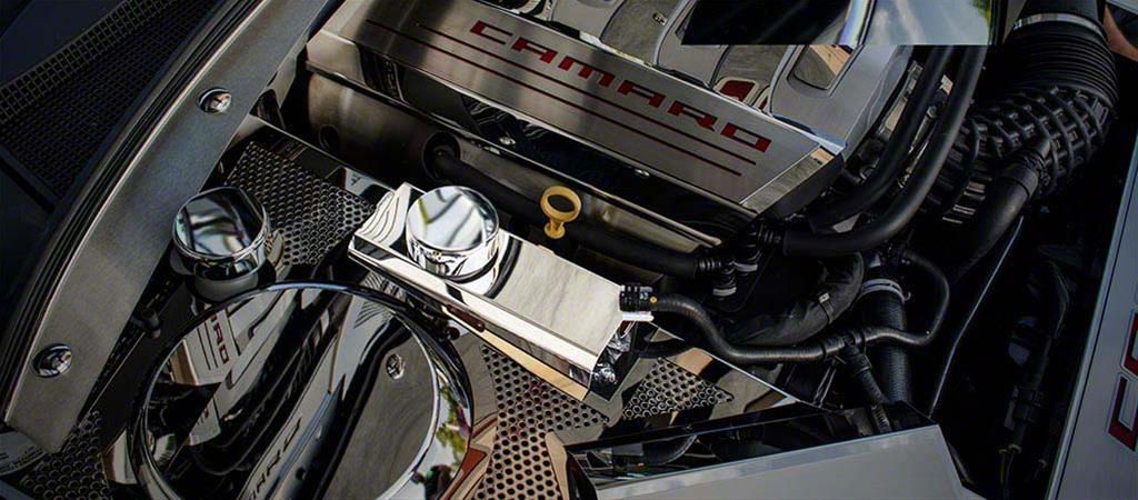 Dress-Up Your Camaro’s Engine Bay. Are you tired of looking at the same mundane engine bay every time you pop your Camaro’s hood? Does the stock underhood appearance clash with your customized exterior/interior? This Coolant Tank Cover is a great way to hide your stained and unattractive reservoir beneath a sleek, stylish stainless steel layer.