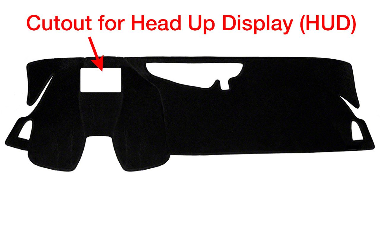 Construction and Appearance. The Custom Fit Dash Cover is manufactured using durable carpet material designed for long-lasting interior protection. Its vehicle-specific molded design follows the contours of the dashboard to ensure proper alignment and full coverage. Finished in black, the cover blends seamlessly with the factory interior and is specifically compatible with dashboards equipped with a heads up display layout.