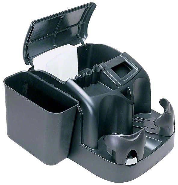 Deluxe Seat Console Organizer in Black. This organizer provides a safe and convenient storage solution for your vehicle's interior. It helps keep the inside of your car organized and free from clutter, featuring two adjustable drink holders and a large compartment for electronic gadgets.
