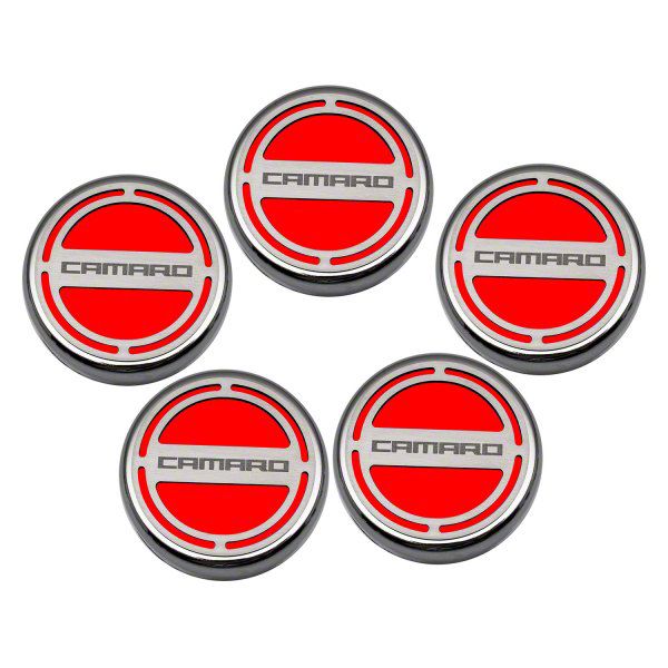 Stylish Engine Caps. The Engine Caps with Camaro Logo are designed to cover your factory fluid caps, covering oil, water, brake, power steering, and windshield washer caps. This set adds a touch of style to your engine bay, making it stand out.