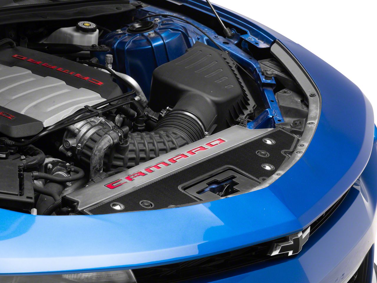Classy Engine Styling. Lighten up your system and spice up what's under the hood with this Illuminated Front Header Plate with Camaro Logo; Carbon Fiber for your Camaro. Sporting bright lettering and quality manufacturing, it offers stunning graphics and a more premium look to your engine.