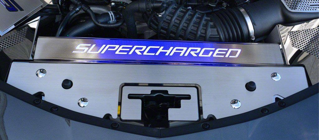 Modern Engine Styling. Light up the look and feel of your engine and give it a stronger feel with this Illuminated Front Header Plate with Supercharged Lettering; Polished for your Camaro. Sporting hard machining, it features a rigid structure that can handle stress as well as withstand vibration and extreme temperatures under your hood while still looking good.
