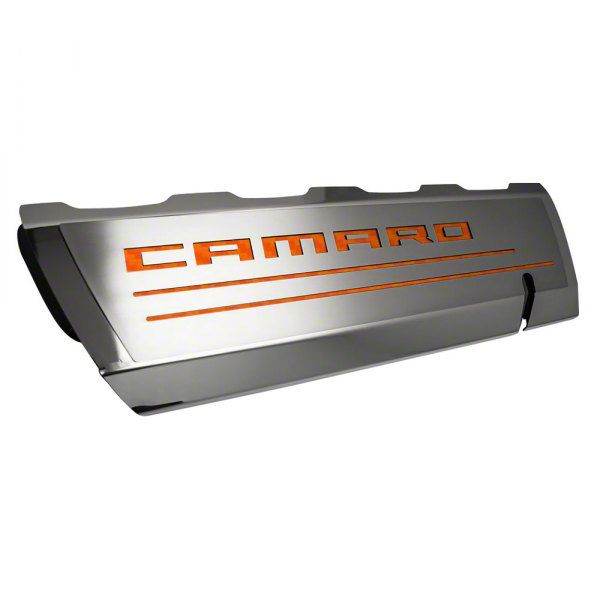 Custom Look. Made for the Chevrolet Camaro SS, these Fuel Rail Cover Overlays have a polished steel finish and an orange carbon fiber Camaro text cutout. Handmade in the USA, these overlays come in pairs and give your ride its own unique look.